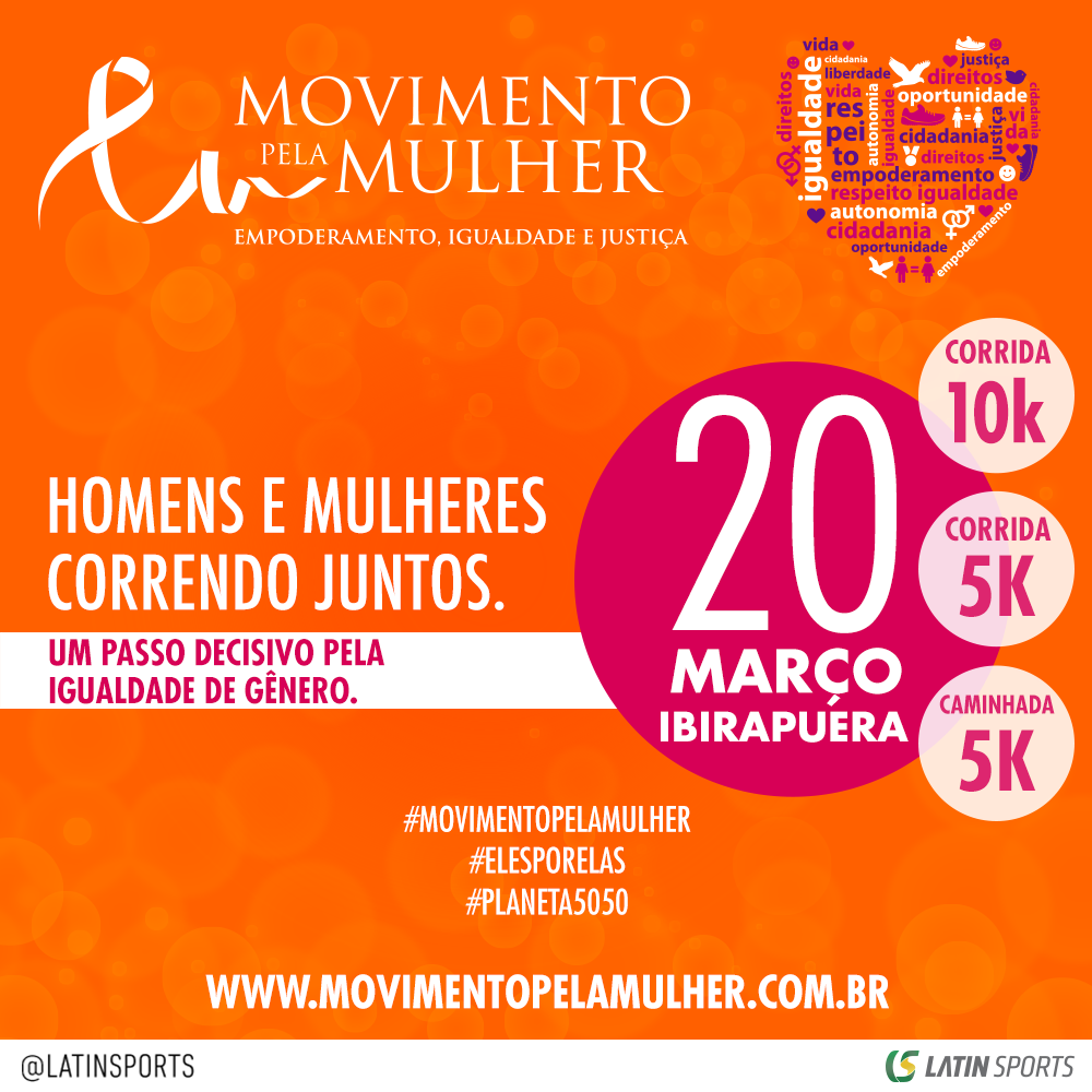 Movimento pela Mulher. Será na região do Ibirapuera, em São Paulo, com largada às sete da manhã na Avenida Pedro Álvares Cabral, em frente a Assembleia Legislativa de São Paulo. Pensado para envolver todas as pessoas, independente de gênero, idade, aptidão e nível esportivo, o evento oferece as modalidades corrida (nas distâncias de 5 quilômetros e 10 quilômetros) e caminhada (5 quilômetros).